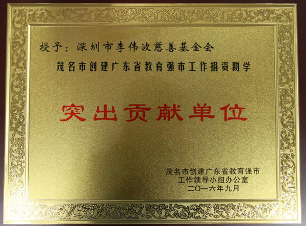 李伟波基金会荣获茂名市教育创强“突出贡献单位”
